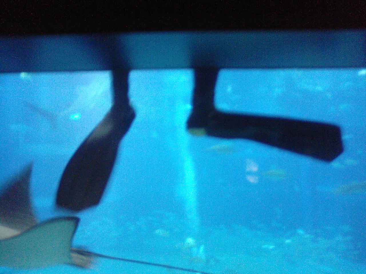 海遊館で水槽の中に足だけ下りてきたので写真を撮りました。足の裏をコチョコチョしたら上に上がっていきました。