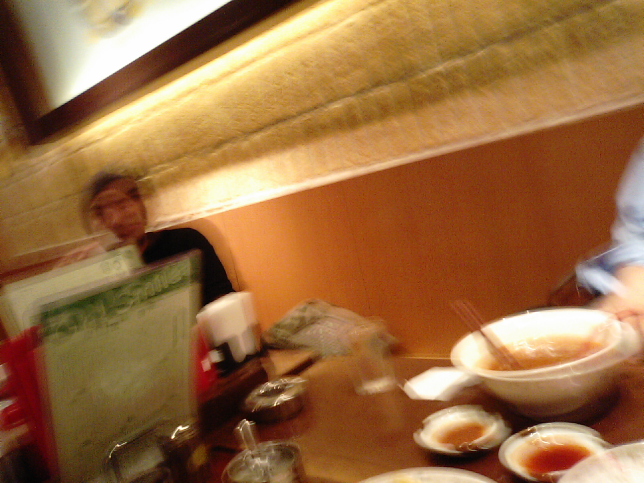 試合を終えて、ひと段落のセイソン選手を発見!ここは大阪王将さんです。実況中継したいのですが、見つかるとセイソンフックを食らう可能性があるので隠れて写真をとっています。食べているものはセイソンボディーを作り上げるのに必要不可欠な、ギョウザ5人前。そして次に口に運んだものは「鳥のように舞、蜂のように刺す」華麗なフットワークの源、鳥のから揚げ!そして次に運ばれてきたのが強靭なスタミナを付けるために週3は食べてるスタミナ定食!そしてデザートは揚げたてアッパーカットのゴマ団子!勢いあまってセイソン選手の強さの秘密バラしちゃいました~。なんとか今日もセイソンネタをゲット出来て僕は幸せです!僕はがんばってますよ~米田さ~ん