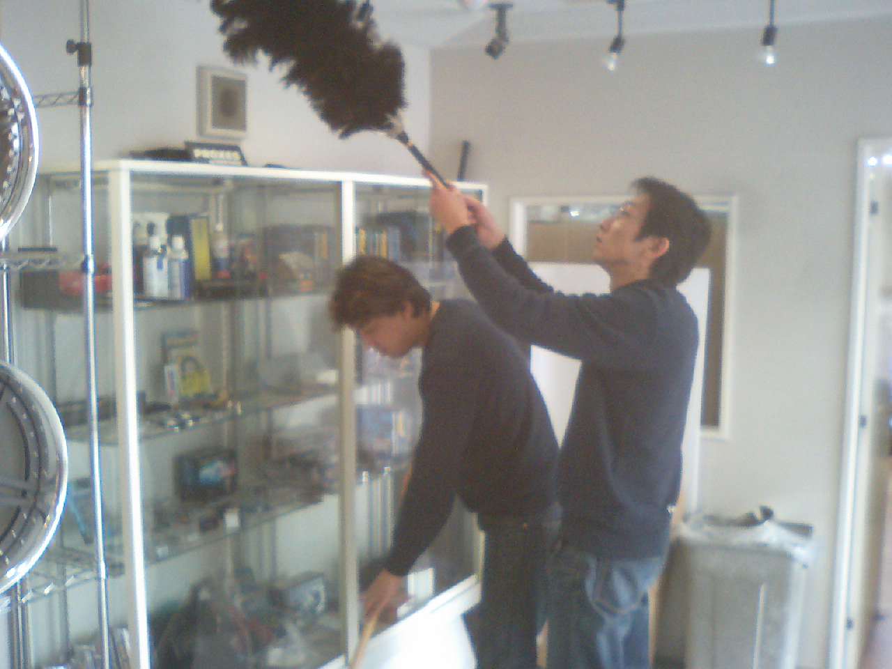 さすがプロ中のプロ!!サササっとスミからスミまでチリひとつ残さず、スピーディーに掃除をしていきました!やはり慣れか、2人の息のあったコンビネーションプレイは作業効率を3倍から4倍に上げると共に、ショールームはピッカピかに輝きはじめました!