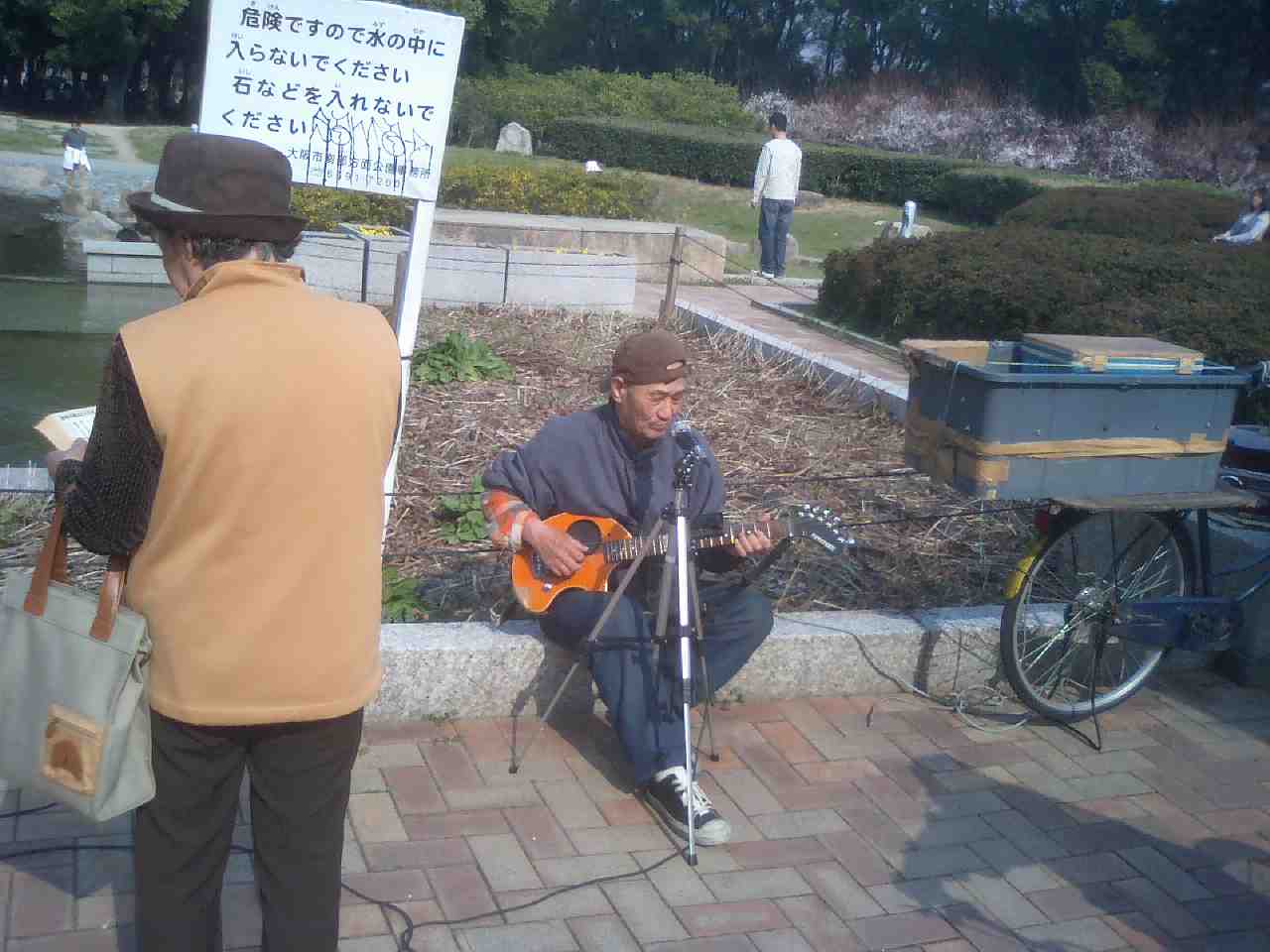 ギターを弾いてる若い男性を発見!!こういうほのぼのしてるのが長居公園のいい所で、僕もついつい横に座って一緒にハモッてしまいました~(冗) しかも良く見てください!ギターはアンプ内蔵のぞうさんです!てことはロックンローラーです。