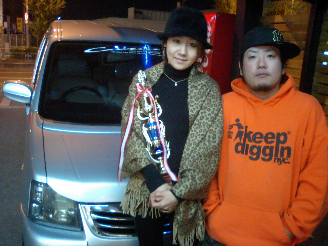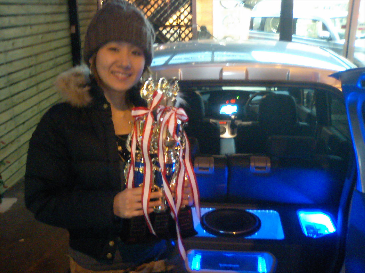 な~んとすごい話が舞い込んできました。なーんともうらやましいカップルでおなじみのムーブに乗っている、かわいい女性オーナーKさんが11月の某イベントに参加してアルパイン賞、ピレリ賞、そしてKカースペシャル賞の名誉ある賞をひとりで3つも頂いたという報告がありました。そして彼氏のTくんも揃って賞を頂いたらしく4つのトロフィーを持ってご来店してくれました。このカップルはホンマにすご~い!内装を担当した僕もかなりうれし~いです。結果が出たことでT.Kさんはこれからも車のドレスアップに力を入れていくことになりました。