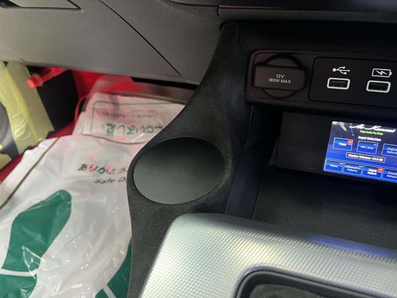 DAPの固定をするにあたり、センターコンソールのアッパーを加工して固定場所を丸で制作。